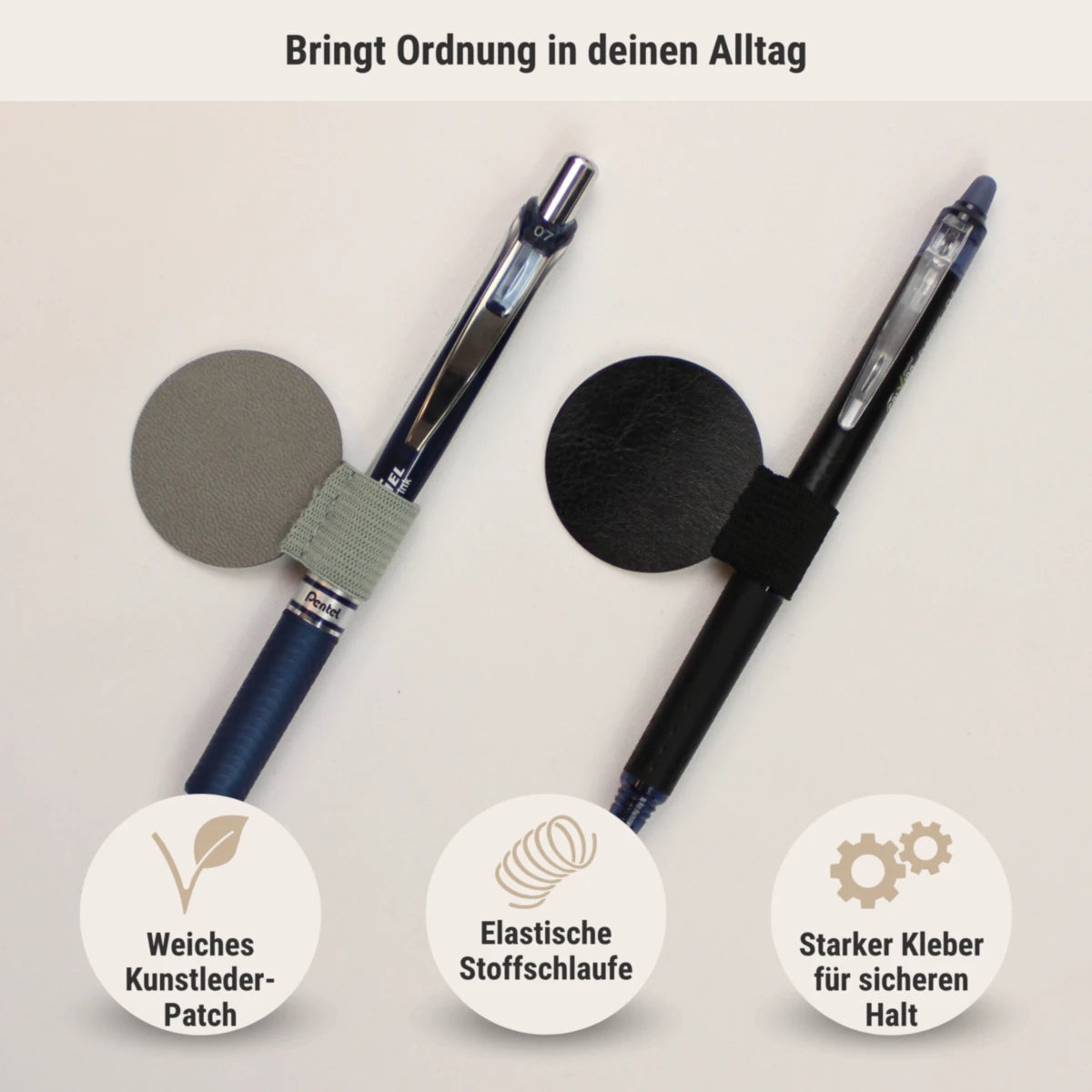 Der runde Patch aus hochwertigem Kunstleder kombiniert mit einer elastischen Stoffschlaufe sorgt dafür, dass dein Stift immer sicher sitzt. Der Kleber haftet zuverlässig auf glatten und leicht strukturierten Oberflächen wie Papier oder Kunstleder.